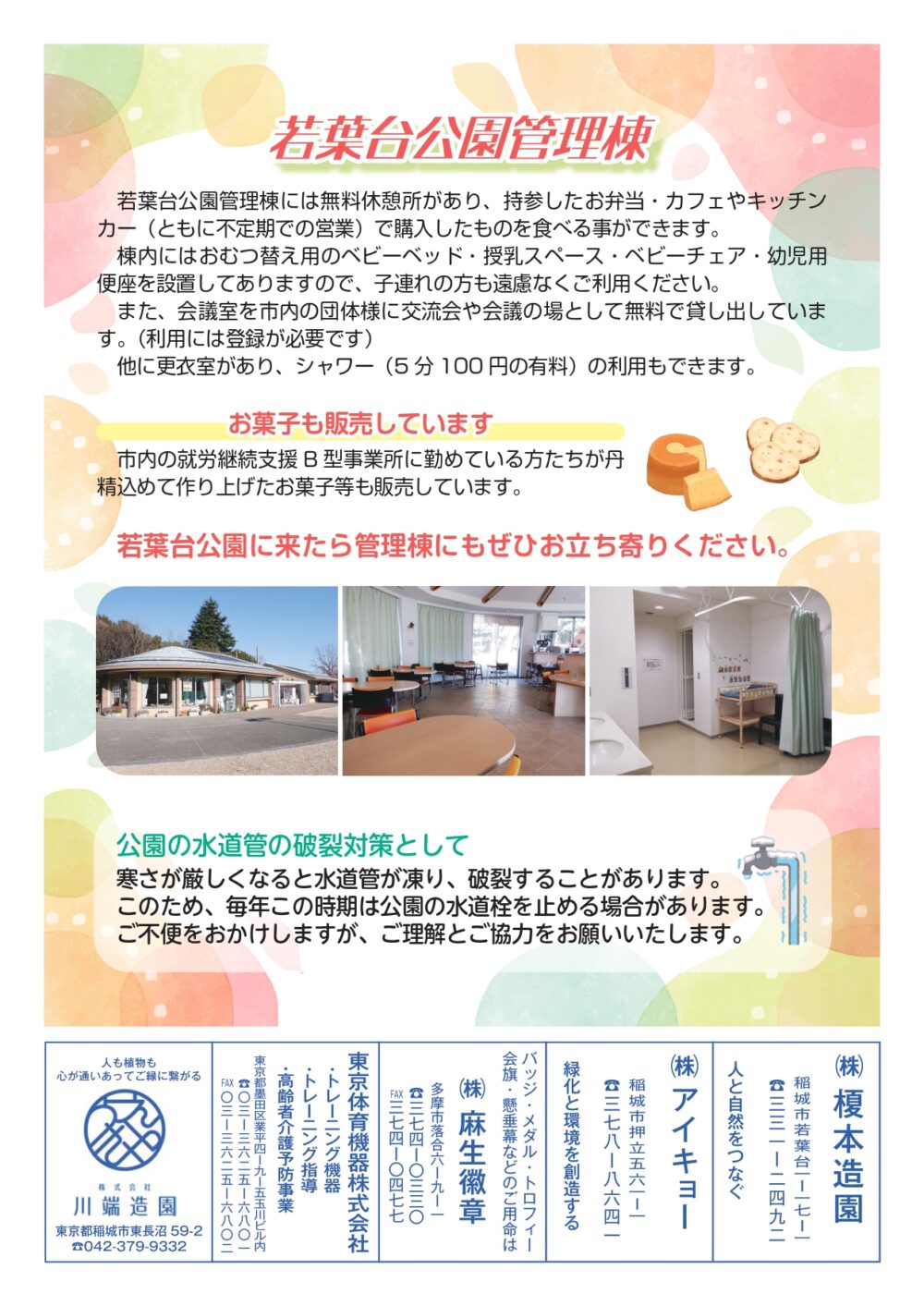 若葉台公園管理棟は、公園利用者の為の施設として、「休憩室」や「更衣室」「シャワー」「車椅子使用者対応トイレ」「会議室」などが設置してあります。
