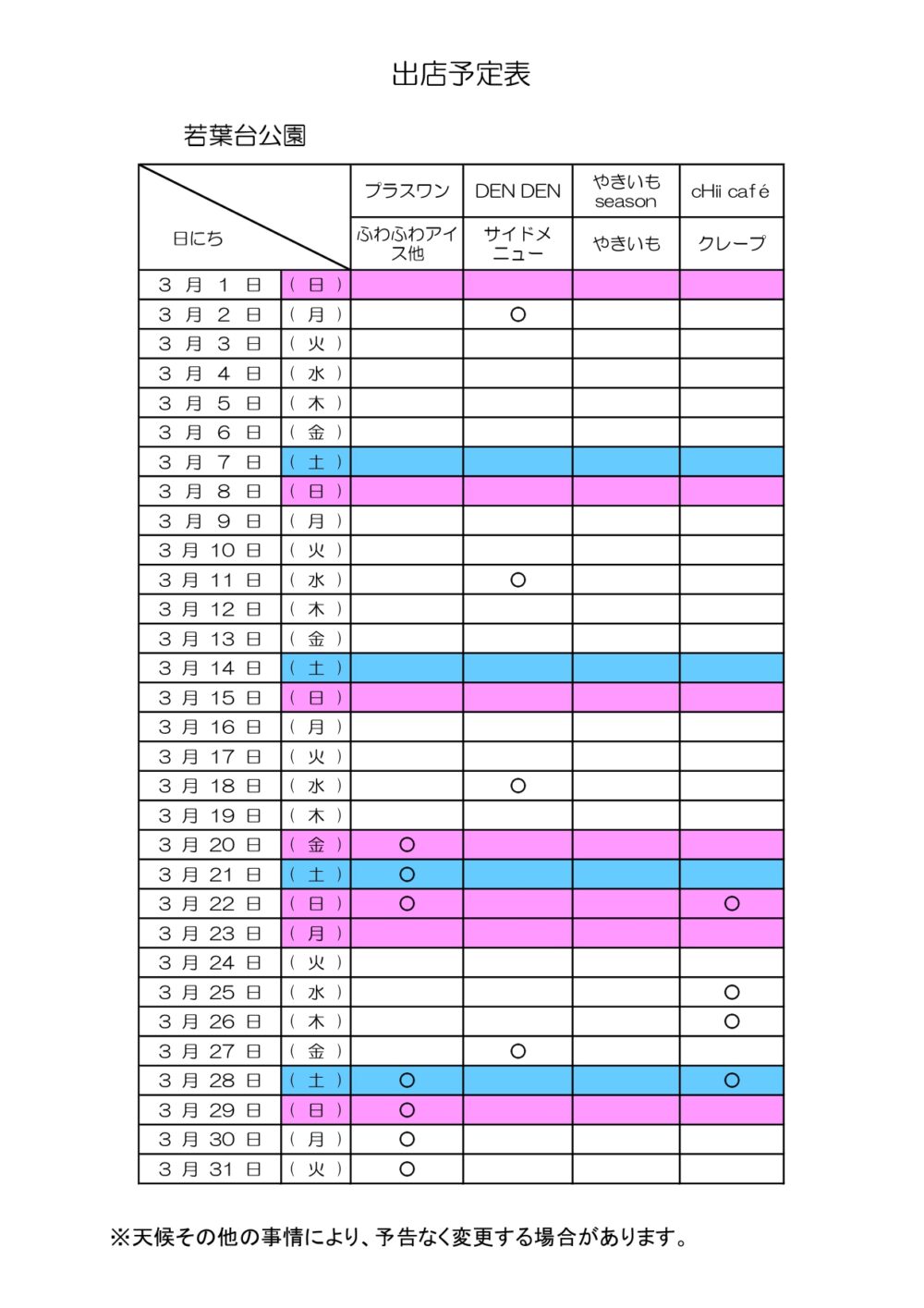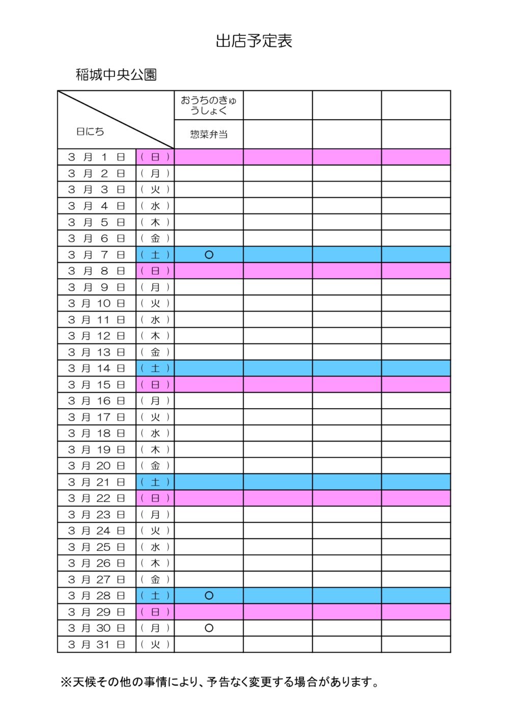 稲城市内公園のキッチンカー出店予定(3月)